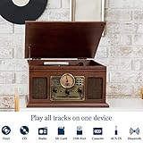 Giradischi Bluetooth 7-in-1 --- Lettore CD, lettore di cassette, Bluetooth integrato per riprodurre musica senza fili dal dispositivo abilitato Bluetooth. Radio FM, riproduzione e codifica USB / SD, jack Aux-in da 3,5 mm per riprodurre musica da qualsiasi dispositivo non Bluetooth (cavo incluso), jack per cuffie e jack Aux-in RCA.