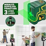 LASER VERDE PI LUMINOSO E ALTA PRECISIONE Proietta facilmente la croce laser verde che pi visibile di quelli rossi e si vede bene anche in condizioni di presenza di illuminazione.La croce laser professionale ha una precisione di livellamento di 2 mm / 5 m, certificato CE / FDA / FCC / ROHS.Utilizzabile per appendere quadri, posizionare staffe, pavimentare piastrelle ecc.Consigliato per chi ama ded