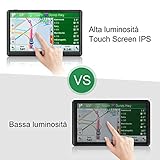 Schermo capacitativo touch screen da 7 pollici ad alta luminosit. La confezione include una lastra di protezione dalla luce, in modo da potere vedere chiaramente lo schermo anche sotto la luce forte del sole. Nelle giornate piovose, il navigatore GPS ad alta luminosit pu fornire una visuale chiara anche con un campo vis