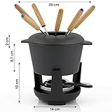 - INCLUSIVO - 1x anello paraspruzzi, 1x Rechaud in ghisa - supporto sicuro e distanza ottimale dal bruciatore, 1x contenitore per la pasta combustibile - con distributore di fiamma, 6x forchette per fonduta, 24 cm con manico in legno, colorato - immersione sicura / nessuna confusione.